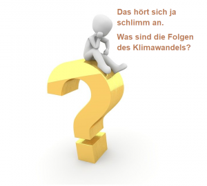 Der Klimawandel kann katastrophale Folgen für Umwelt, Tiere und Menschen nach sich ziehen: Gletscher und Polkappen schmelzen ab, der Meeresspiegel steigt an. Durch den Anstieg des Meeresspiegels sind viele Küsten und Städte bedroht. Es kann zu starken Regenfällen und Überschwemmungen kommen. Kleine Inselstaaten könnten im Meer versinken. Während es auf der einen Erdhalbkugel zu viel Wasser gibt, mangelt es auf der anderen Erdhalbkugel an der Wasserversorgung. Die Wüsten breiten sich noch weiter aus. Es kommt zu starken Hitzewellen und großer Trockenheit. Dürren haben zur Folge, dass auf den Feldern nichts mehr wachsen kann; die Ernten können ausfallen, Nahrungsmittelpreise steigen und noch mehr Menschen auf der Welt werden Schwierigkeiten haben sich zu ernähren. Durch eine sinkende Wasserqualität können bestimmte Bakterien leichter verbreitet werden und ansteckende Krankheiten können sich vermehrt ausbreiten. Auch können sich viele Tier- und Pflanzenarten nicht oder nicht schnell genug an die veränderte Umwelt anpassen, die der Klimawandel mit sich bringt. Sie drohen auszusterben.