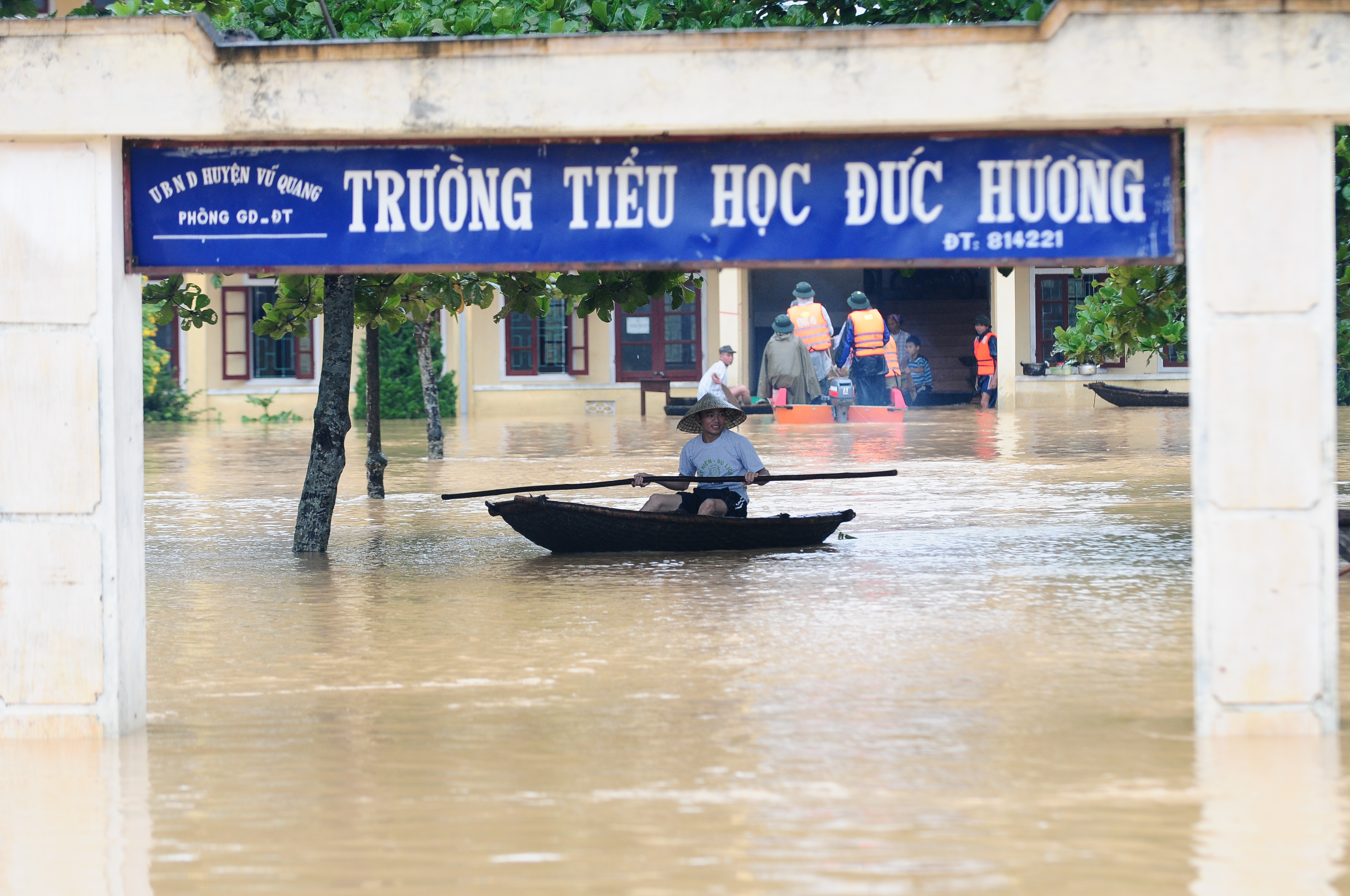 Ein Mann in einem Boot vor einer Grundschule. Die Schule ist zur Hälfte in tiefem Wasser. In den mittleren Provinzen in Vietnam gibt es jedes Jahr Stürme, aber in den letzten Jahren wurden die Stürme schwerer und verursachten größere Probleme für das Leben. Das Foto zeigt, wie Kinder in der Schule eingeschlossen sind. Die lokalen Behörden müssen ein Rettungsteam schicken, um sie abzuholen.